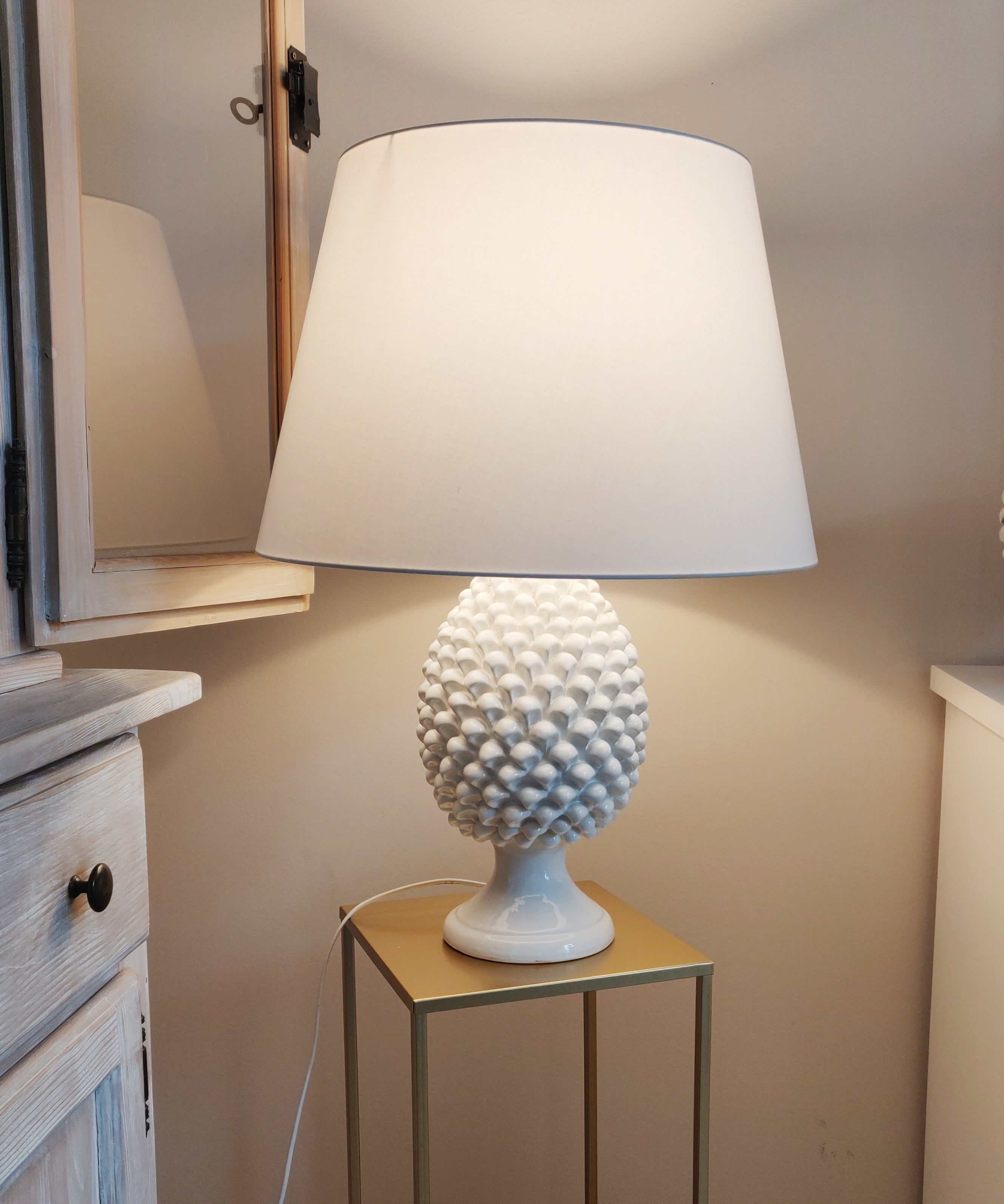 Elegante Lampe mit weißem Tannenzapfensockel und passendem Schirm. Der Tannenzapfen ist 35 cm hoch, der Lampenschirm hat einen Durchmesser von 40 cm.